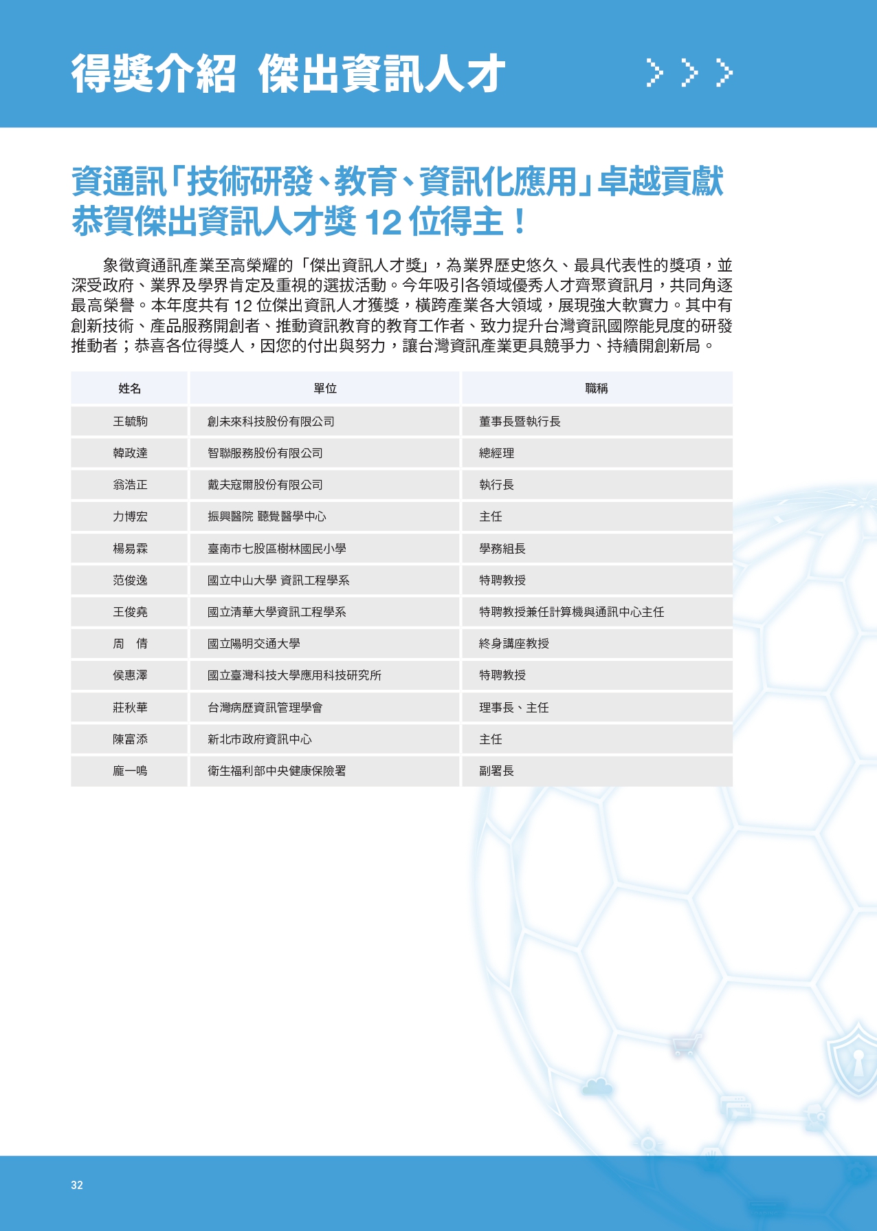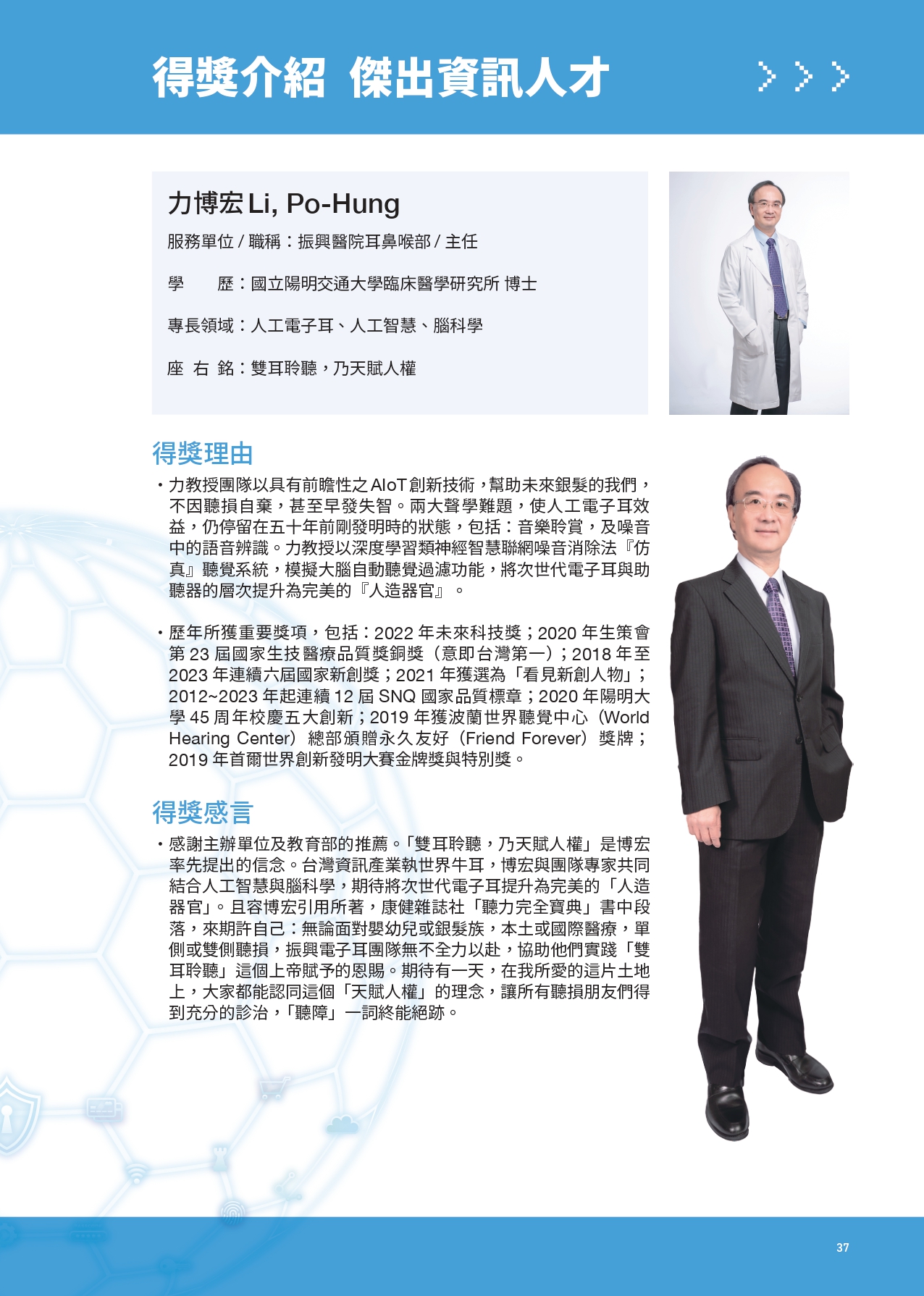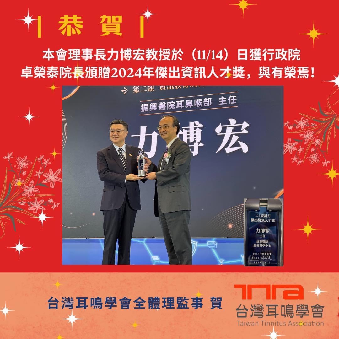 熱烈祝賀! 本會理事長力博宏教授憑藉其領導團隊於AIoT及聽覺科技領域的創新研究與卓越貢獻,榮獲 2024年「傑出資訊人才獎」。此殊榮彰顯力教授在推動銀髮族聽損解決方案、改善人工電子耳效能以及創新應用深度學習技術方面的領導地位。 力教授的研究成果不僅為聽損族群帶來福音,更提升了台灣資訊科技的國際影響力。再次感謝力教授的卓越努力,為學界及產業注入無限動能!